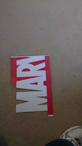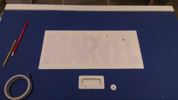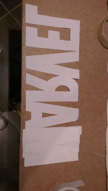 Debido al tamaño de mi caja que tuve que usar 2 hojas de x A4 para crear la plantilla. Imprimí el primero a partir de la M y el segundo final con la L. Corté las letras usando tijeras y un cuchillo, el MAR, en la primera hoja y RVEL por otro. Luego pegué la dos R superpuestos para hacerme mi todo Stencil de Marvel.