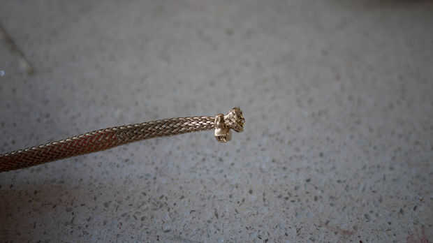 Al llegar al revés de la final de la trenza en sí mismo y utilizar una sujeción de cable para sostenerlo. El resultado es un oro mirando la cuerda con un secreto que brilla intensamente.