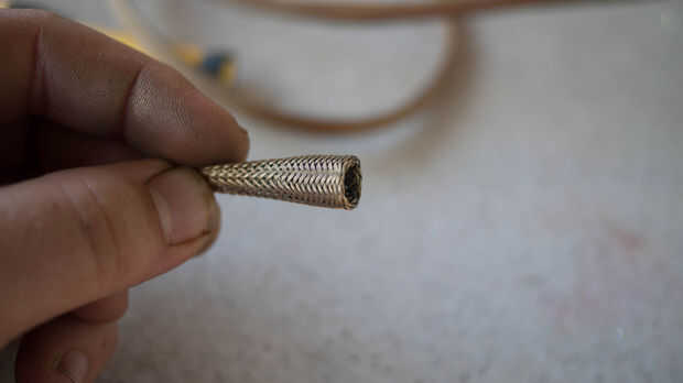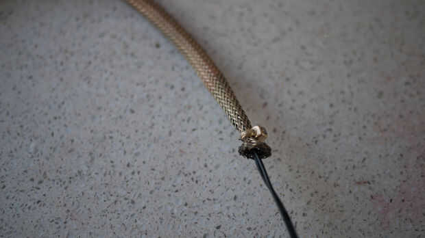 Una vez que la trenza llegue el cable de conexión utilice un empate de oro cable para sincronizar apagado aquí. Doble el nuevo extremo de su trenza dentro de sí mismo y trabajar hasta conectarse a la siguiente pieza de la trenza. Tuve que usar dos longitudes para llegar al final del lasso.