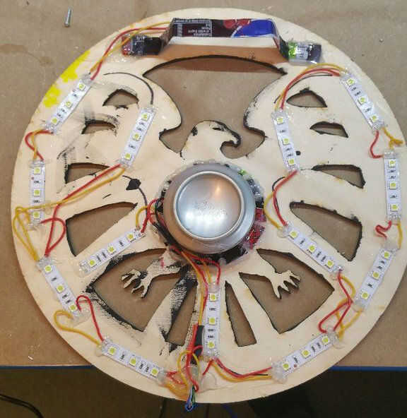 La cubierta del centro también se une con pegamento caliente, asegúrese de que pasar los cables de los LEDs hacia fuera antes de pegarla en su lugar!