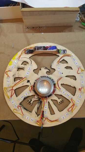 A continuación corté la tira de LED en los puntos adecuados y los colocó en la parte posterior del escudo donde se conseguirá la mejor cobertura, esto es prueba y error, la aplicación del sentido común también es muy buena :)