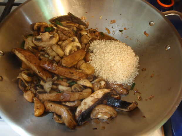 Risotto, tradicionalmente un norte plato italiano de arroz de grano corto cocido en acción, felicitó con mantequilla y vino blanco para terminar este plato. Risotto con frecuencia se cuece hasta que tenga una textura cremosa muy lujosa. Este plato ve