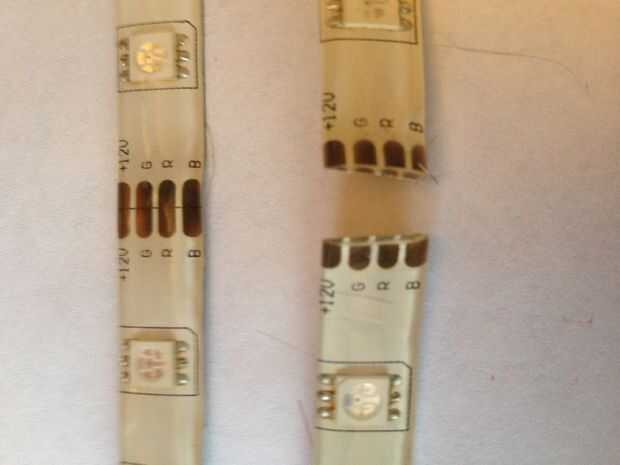 Ahora una vez que sepa cuántas tiras te necesita puede cortar a lo largo de los puntos señalados (cada tres leds). Asegúrese de dejar pastillas de cobre en cada tira.