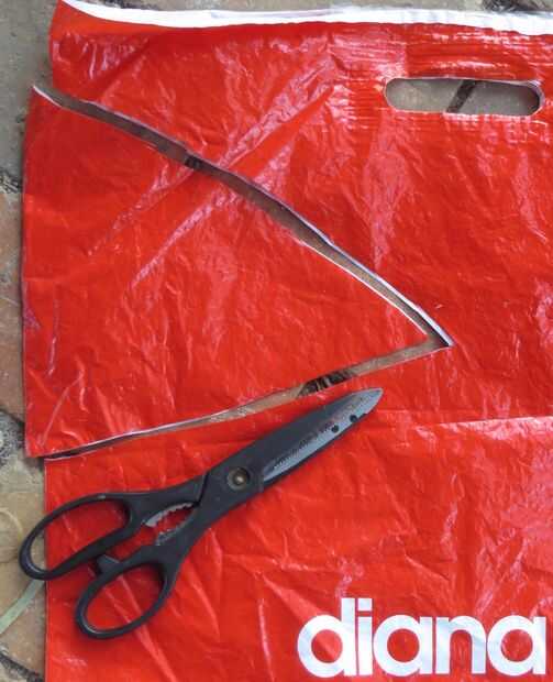 Corte una forma de la bandera del lado de la bolsa, a través de ambos espesores, para que el doblez del lado está intacto.