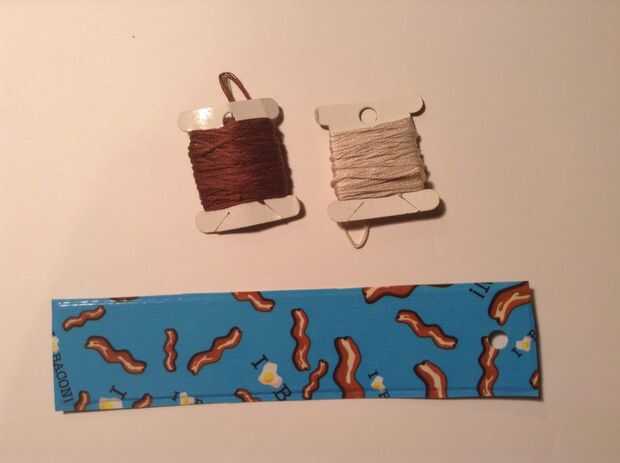 5. para la borla corto longitudes de 4 a 7 pulgadas de longitudes marrón de seda y 3-7 pulgadas de hilo tan. Dobla el hilo por la mitad y me metido el doblez a través del orificio en el marcador y luego los extremos sueltos de la seda a través del lazo creado. Tire firmemente.