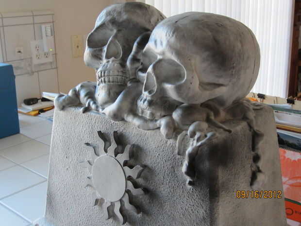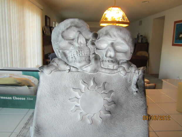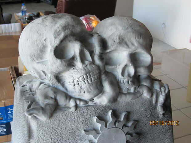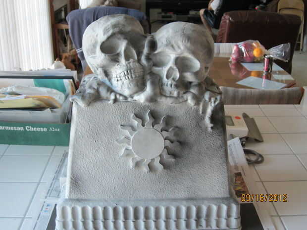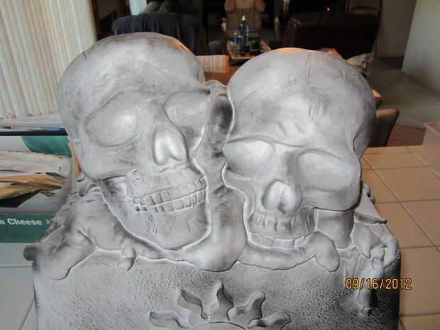 usé una vieja espuma de poliestireno más fresco, 2 cráneos de espuma de poliestireno de Michael, un medallón de madera sol (también de Michael), cosas grandes, ampliar la espuma, pintura de piedra blanca y negra spraypaint. Había pegado los cráneos con woodglue luego había pegado a la "cima" de la nevera. Dicho todo esto tomó unos 10 minutos para armar y alrededor de una hora a esperar a que la pintura se seque. (Ayuda que era 103 ese día).