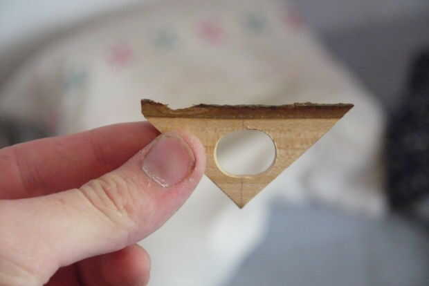 Marcar la altura de tu triangulo y perfore un agujero en el medio. Luego agrandar el agujero para el pulgar, puede delinear también el pulgar primero y luego perforar.