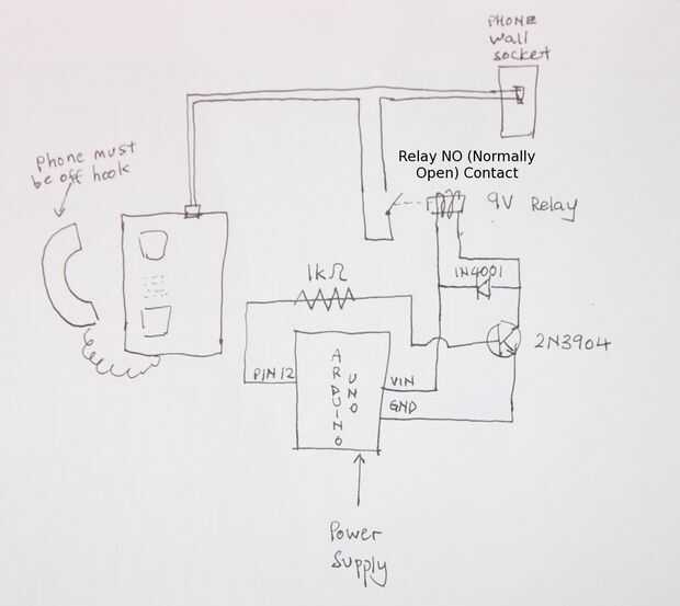 En mi caso, destruyó a un teléfono barato y ocupa mi Arduino dentro. Si no desea abrir o destruir cualquier teléfono, puede empalmar la línea de teléfono a teléfono y conectar tu Arduino allí. El siguiente diagrama muestra cómo todo está conectado.