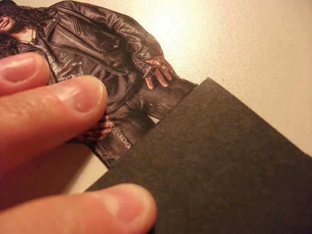 Te darás cuenta que la figura es más gruesa que la cartulina, agregó. Para nivelarlo, necesitan cortar otro trozo de cartulina. Debe ser la misma longitud de la tarjeta bajo barra. En mi caso, corté un pedazo de bolsa tarjeta mide 10 x 3 cm.