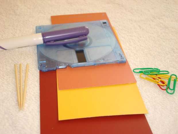 Pequeños trozos de papel de colores. Una cartulina de peso ligero es perfecto. Clips de papel. Selecciones de diente. Disco. Marcador. Metal redonda de disquete para el cierre. Imán.