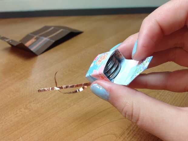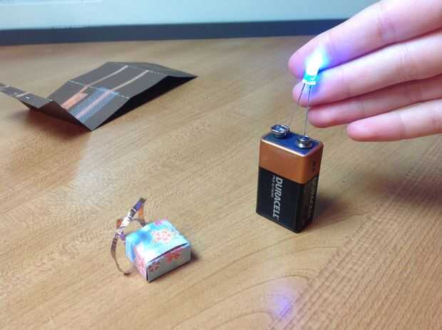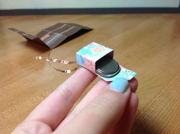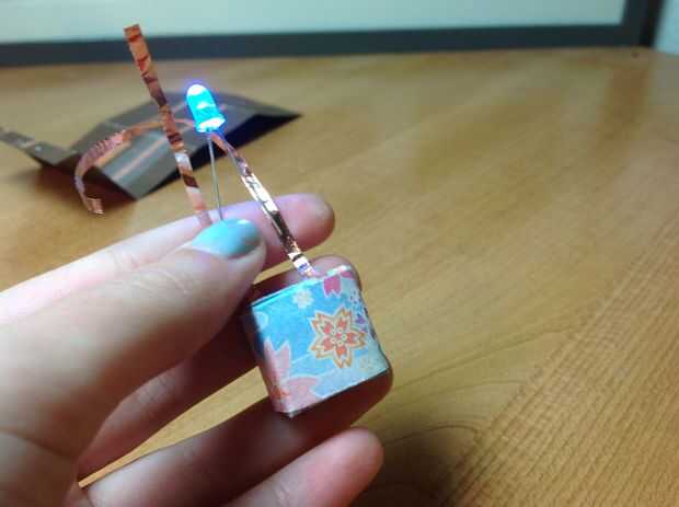 Pongo papel origami decorativo alrededor de mi caja de la batería porque la caja es la parte que sobresale para la decoración cuando se utiliza como un marcador. Colocar la batería en el lado positivo y suavemente Coloque los tres en la parte superior de la misma manera. Deslice la lengüeta de cierre en, asegúrese de que está por encima de la aleta negativa en el interior de otra manera interfiera con la conexión. Probarlo con un LED. Como se puede ver, es simplemente tan brillante como los 9V.