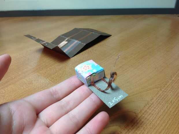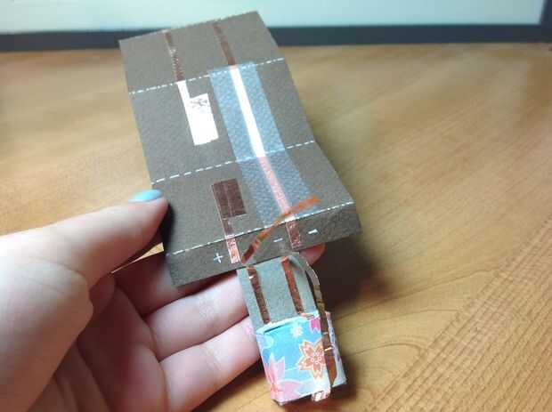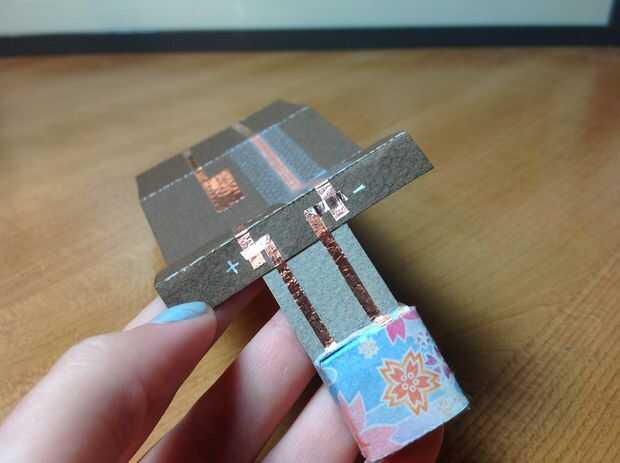 Ahora vamos a ponerlos juntos! Corte otro pedazo de cartulina (Asegúrese de que el material que elegiste para esta parte es fuerte pero flexible) que mide 2x5cm. La longitud no es demasiado importante, asegúrese de que la anchura es de 2 cm. la caja de la batería en el borde y presione hacia abajo la cinta de cobre formas un poco a lo largo de la tira de pegamento. Pegue el extremo de la tira en el centro de la base hasta el borde de la marca de pliegue de 1 cm. Colocar la cinta de cobre y doble encima de lo que pone en la parte superior las piezas positivas y negativas de la cinta de cobre. Recorte los extremos y presionar firmemente la cinta de cobre. Puede cinta la parte posterior para mayor seguridad.
