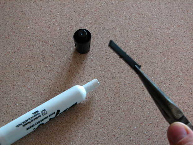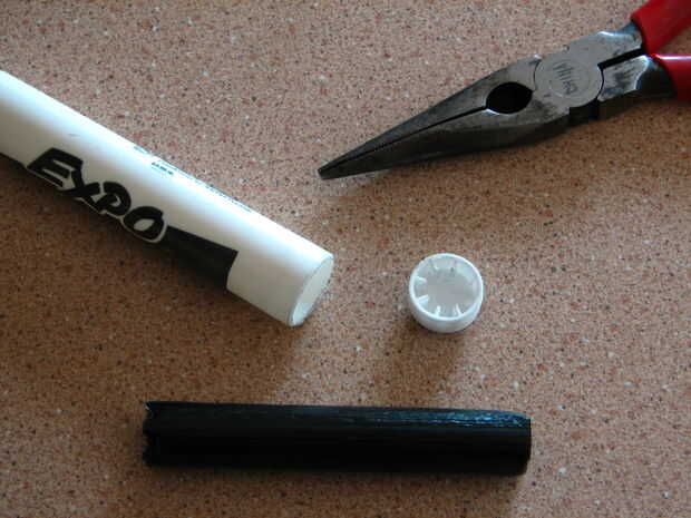 Utilizando los alicates de nariz de aguja salga de la punta del marcador. Usted quiere ahorrar para otro proyecto, pero para este se puede descartar que no es necesario. A continuación, agarre firmemente una de las piezas de plástico (las que sostenga la tapa en lugar cuando su puesto en la parte posterior) y tirar. Tendrá que trabajar su manera alrededor de la tapa final agarrando y tirando cada uno hasta que finalmente sale; Cuando retire el tubo de plástico dentro.