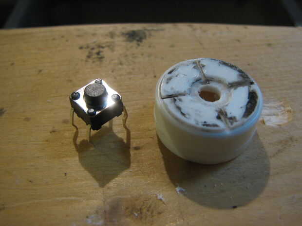 Porque el plástico es más grueso que el tamaño del botón, debe cortar un cuadrado en el plástico sin pasar por el otro lado. El tercer cuadro coincide con lo que estoy diciendo. Quiere tallar un cuadrado ligeramente más grande que el interruptor, para que cuando el interruptor se coloca en la Plaza el botón sobresalga por el otro lado. La punta del botón debe plantearse en comparación con el resto del plástico. Después de haber completado con éxito este paso, ajustar la tapa y cambiar a un lado.