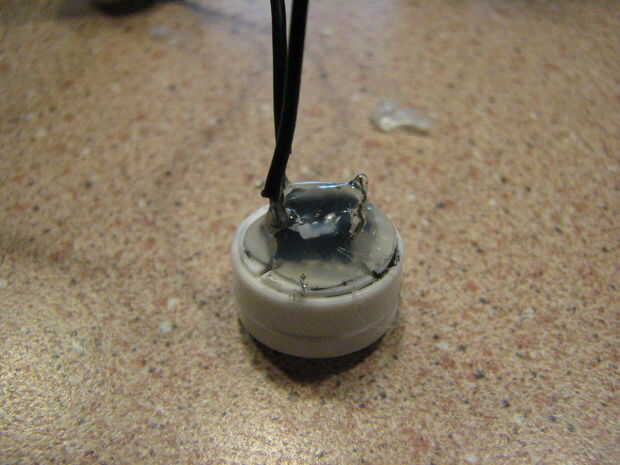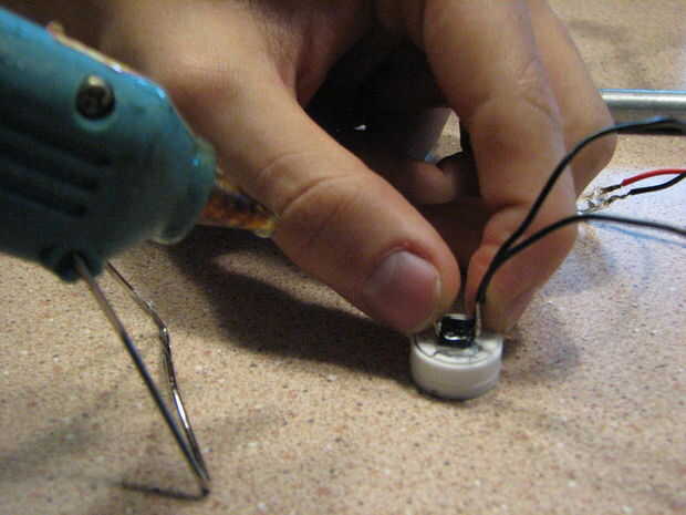 ¿Todavía tiene la tapa a un lado? Bueno, lo que necesitamos ahora. Coloque el botón en la Plaza de la tallada hacia fuera (Asegúrese de que el botón se resalta en el otro lado!) y aplicar pegamento caliente para mantener en su lugar. Tip: utilice un mondadientes o un destornillador pequeño para mantener el botón en su lugar mientras el pegamento se refresca.