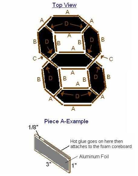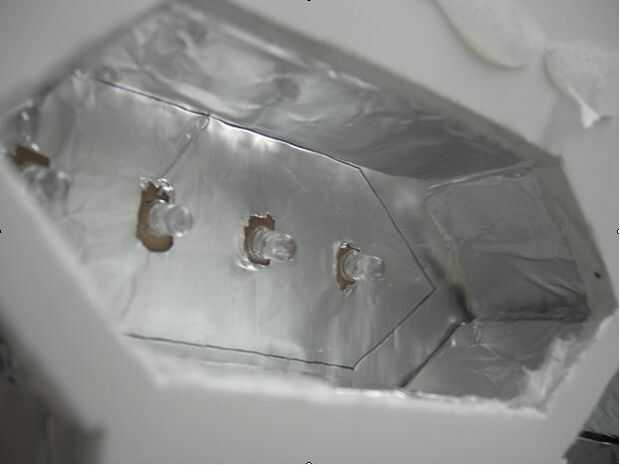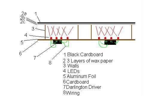 Una vez que tengas todas las piezas de corte, entonces necesitará papel de aluminio de la cinta a un lado. (De doble cara cinta funciona muy bien). Esto va a dar a cada segmento una mirada muy completa, por que refleja la luz de los LEDs. No olvide que algunas de las piezas poco tienen a ambos lados cubiertos de papel de aluminio ya que sirven como un muro de más de un segmento. Una vez que esto se hace, es hora de pegar. Asegúrese de que los dígitos están inclinados a la izquierda. Pegar las paredes a la Junta de núcleo de espuma en la parte más fina de la pared. Vea la figura 2. Ahora repita este proceso para el segundo dígito. Una vez hecho esto pedazos de cinta de 3 de papel de cera en la parte superior de las cifras de la Junta de núcleo de espuma, esto se dispersará los LEDs individuales y crear más de un look completo. Luego pegar la cartulina negra en del papel de cera. Ahora a la electrónica...