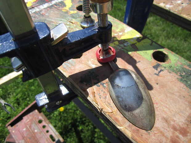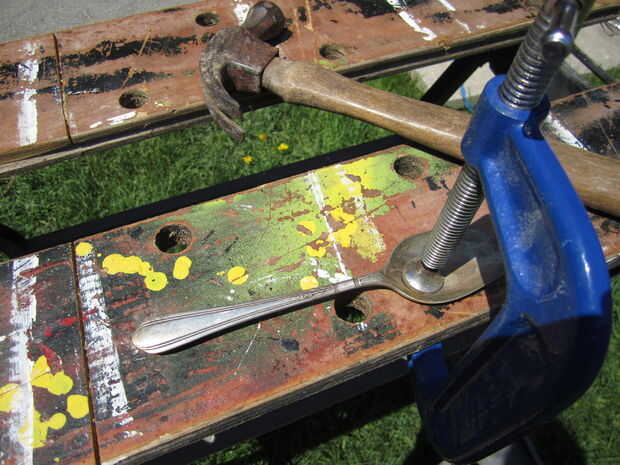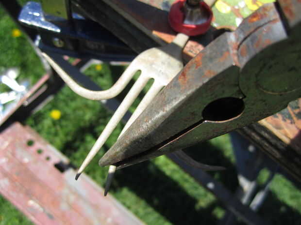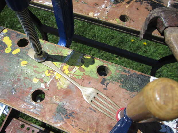Para aplanar un tenedor, el método es aún más sencillo. Por alguna razón, las horquillas son mucho más fáciles persuadir a plana de cucharas. Primero, sujete el extremo derrochado en su mano y use el martillo para aplanar hacia fuera del mango. Abrazadera de la horquilla frente al Banco de trabajo, a continuación, darle un par de buena pega donde la horquilla curva, en la base de los dientes. Esto debe aplanar completamente el utensilio. Para añadir un pequeño toque a la horquilla, sujete el mango a mesa de trabajo en ambos extremos, dejando el voladizo de las púas. Utilizando los alicates de nariz de aguja, suavemente doblar y hacia afuera, cada diente de la curva en el diseño de su elección.