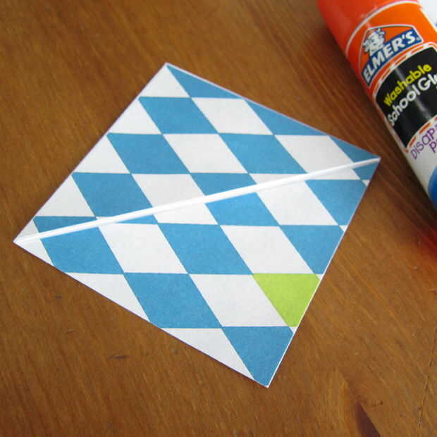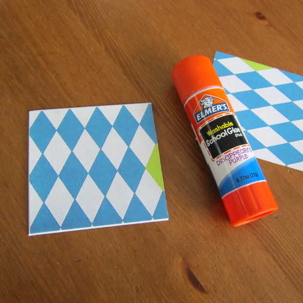 Utilizando un pegamento pegamento stick una mitad a la parte superior de la parte doblada de la dotación y a la parte inferior. Haciendo la cabeza y el mentón.