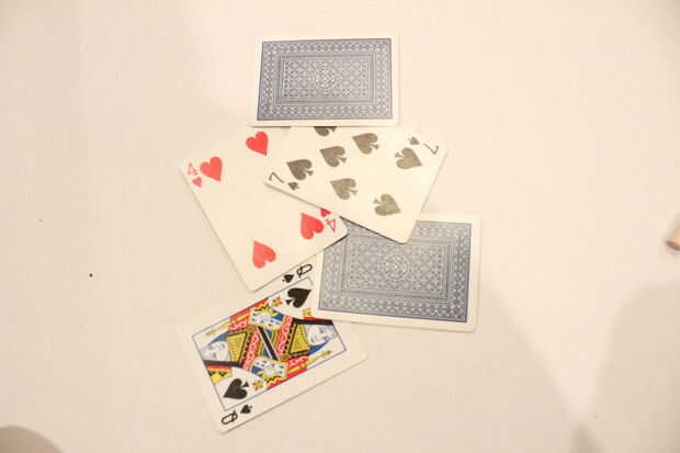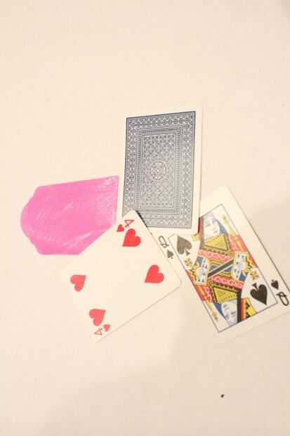A continuación, he acumulado jugando a las cartas desea utilizar y los colocó en la marca de libro. Está bien que los juegos de cartas pegar fuera de la marca de libro. Asegúrese de que utilizar diversos lados y tarjetas colocadas al azar.