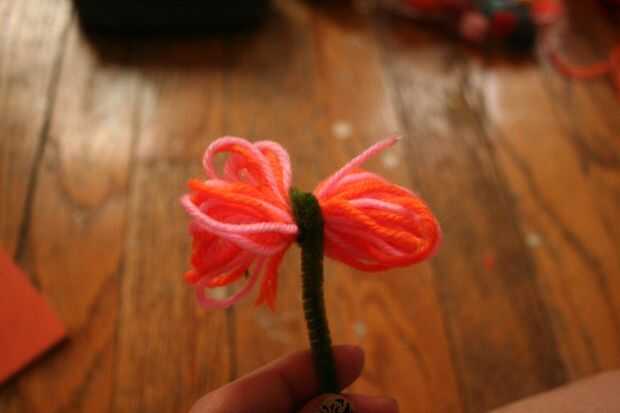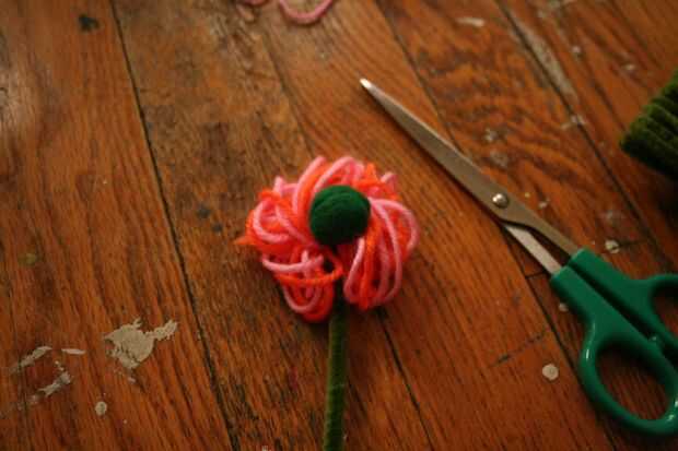 Envuelva un limpiador de pipa verde alrededor del lazo y gire firmemente. Tire el hilo alrededor para parecer una flor. Terminar pegando un pom pom en el centro. Déjelo secar.