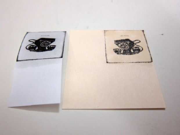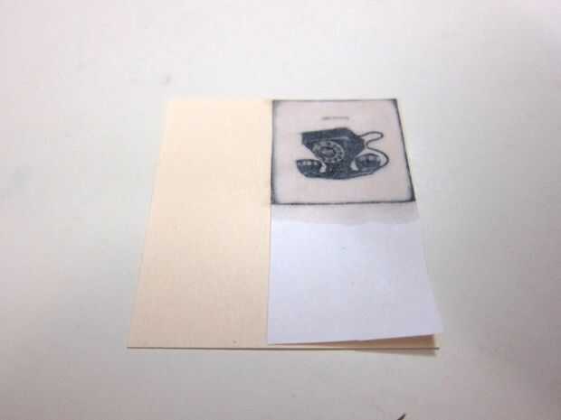 Levante cuidadosamente la imagen y, voila! imagen transferida. la imagen con aspecto un poco fuera de foco, un poco vintage, eso está bien. es el aspecto de transferencia de xileno. Si desea algo más crujiente, intente imprimir directamente en la cartulina.