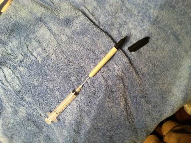 07/04/14 edición: he probado método de Petrucci de recarga Sharpies con hipodérmicas de 2 ML de acetona. Inyecta en la parte trasera a través de la caja de plástico. Impulsó con la jeringa vacía, tirada de él hacia fuera y llené con la acetona 2ML y luego se inyecta.