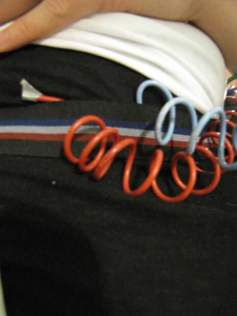 Estirar splay los cables con gran efecto y meter los extremos debajo del elástico.  Puede asegurar con cinta más o simplemente doblar el extremo del alambre en un gancho y gancho encima del elástico para quedarse.