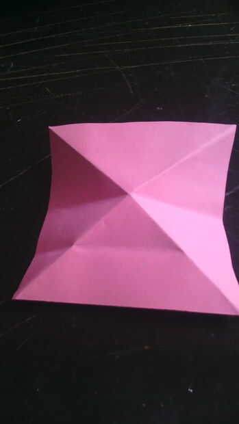 instruccionesPaso 1: Empezar con un papel de origami cuadrado de 6 pulgadas x 6 pulgadas (15 cm x 15 cm), color de lado hacia abajo.dobla el papel por la mitad en tanto eje diagonal. pliegues bien y despliegue.Paso 2: Doble las 4 esquinas hacia el ce