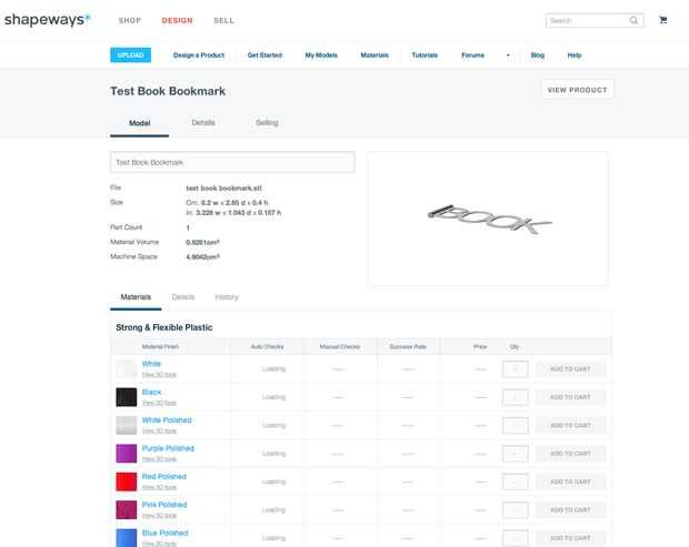 Shapeways luego Compruebe su archivo y decirle qué materiales se pueden imprimir en y a qué precio. Este modelo vino en a $3,79 en los distintos colores de plástico fuerte y flexible.