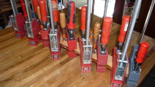 Abrazadera Abrazadera Abrazadera dondequiera que puede, intenta utilizar sus pinzas. Mis favoritos son las abrazaderas de Bessey K. Comenzar en el medio de sujeción, asegúrese de que las piezas se alinean a lo largo de al menos un borde largo y pinza de lados alternos, trabajando hacia los extremos hasta que toda quede asegurada.