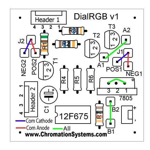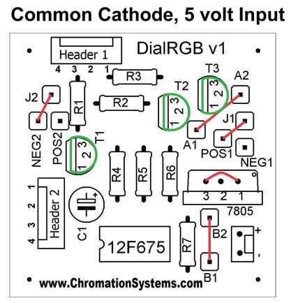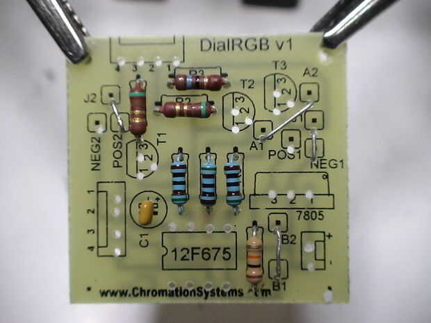 El kit completo con 3 vatios LED RGB no debe usar un regulador de voltaje 7805. Debe utilizarse una entrada de 5 voltios. Y los pads de soldadura para el 7805 se saltó y llena.