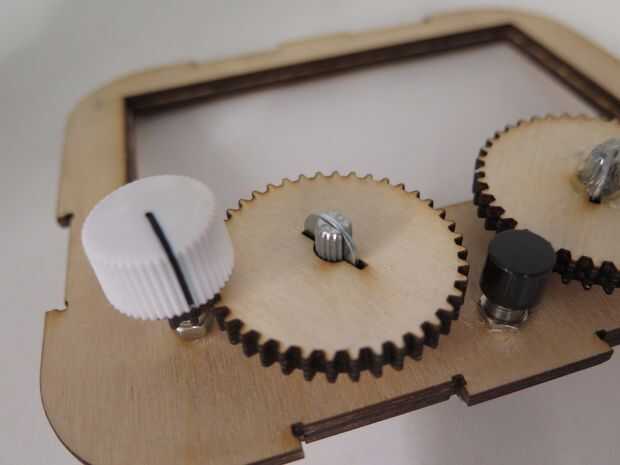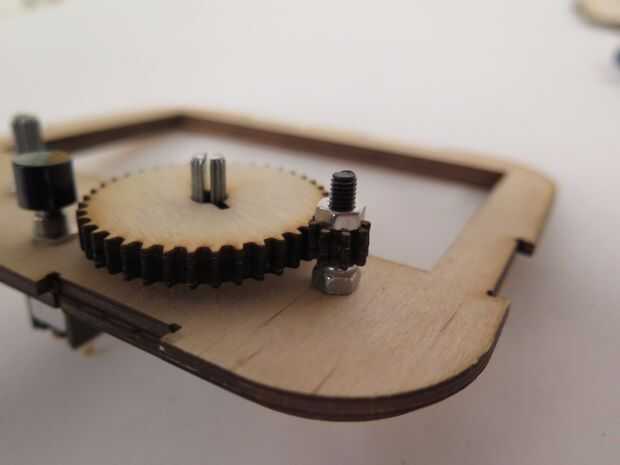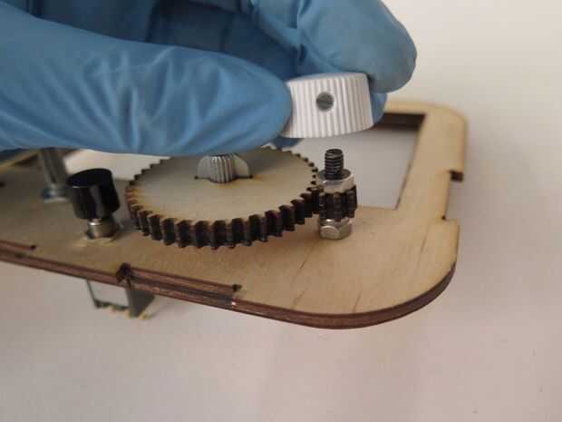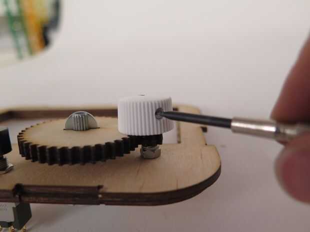 Hilo de rosca a través del tornillo de M4 de la parte posterior de la placa frontal del controlador y apretar una tuerca de nylon. No quieres apretar la tuerca de nylon completamente porque entonces la perilla no gira, simplemente apretar una vuelta antes de apretado. Luego coloque el engranaje pequeño encima de la tuerca de bloqueo y apriete otra tuerca hasta que el engranaje gira al girar el tornillo. Agarra tu mando y afloje el tornillo lo suficiente como para poder encajar la restante parte expuesta del tornillo dentro y apriete así. Usted debe ahora estar cambiando el pequeño engranaje al girar la perilla.