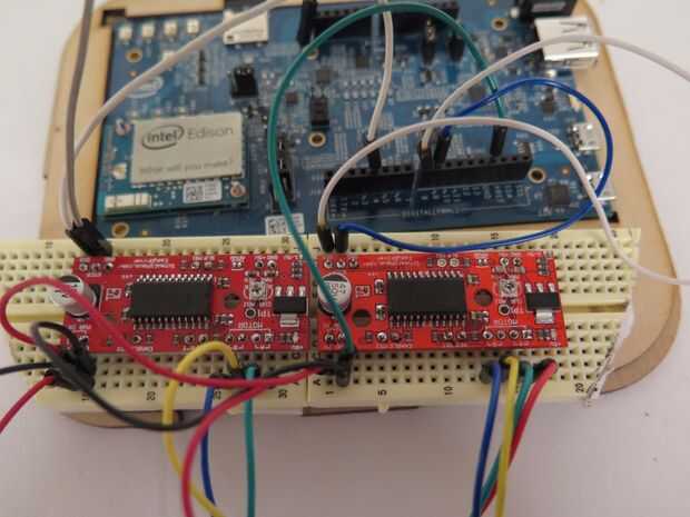 Inserte el controlador de motor paso a paso grande fácil de la placa y conecte dos cables a la tierra pines Dir y paso en la Junta. Luego conecte el extremo opuesto de los cables a los pines 8 y 9 o la placa de Arduino Edison breakout. A continuación te quieres conectar los 4 cables que salen del motor paso a paso en los 4 pernos en la junta grande fácil.