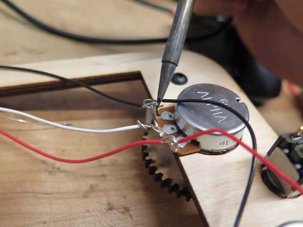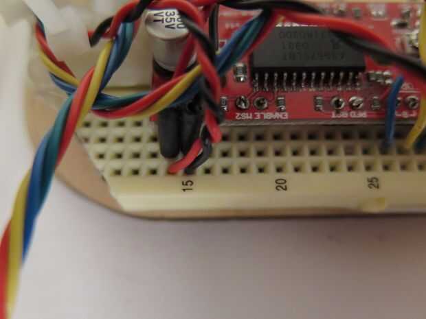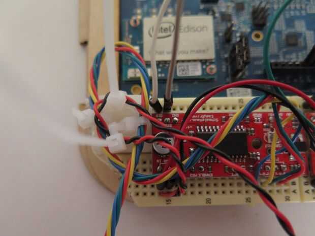Soldadura la corriente (rojo), señal (blanco) y los cables de tierra (negro) para el potenciómetro. El cable de la señal irá a la clavija de entrada analógica A0 en el escudo de Edison. A continuación, tira de los cables procedentes de la verruga de la pared de 12V y conectar a la corriente y tierra pines de la tarjeta de motor paso a paso. Por último, atar todo con ataduras de cremallera para evitar conseguir apretamientos, estiramientos hacia fuera.