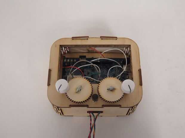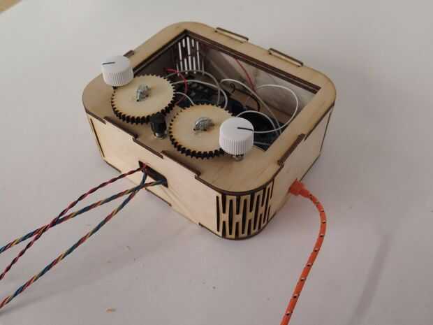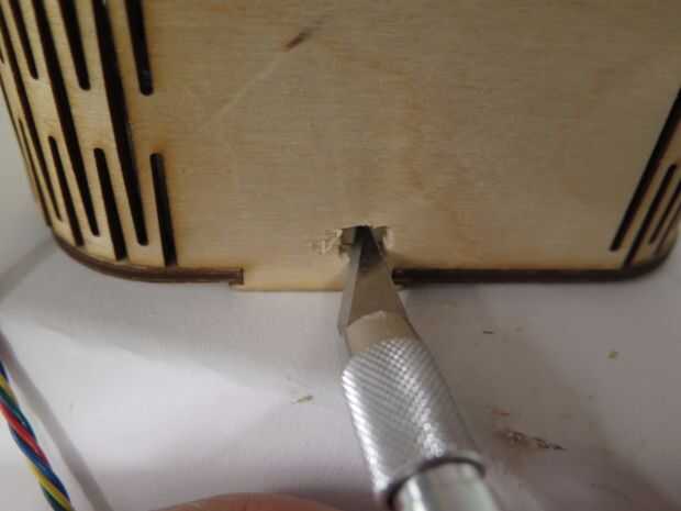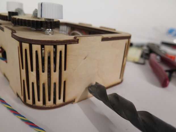 Después de que el diseño fue terminado me di cuenta de que sería más fácil para no tener que quitar al Edison de la caja cada vez que he querido poner nuevo código en él. Así que perforé un agujero pequeño, que apartó a un conector tamaño rectángulo de cable USB.