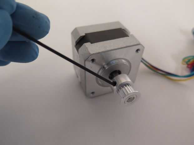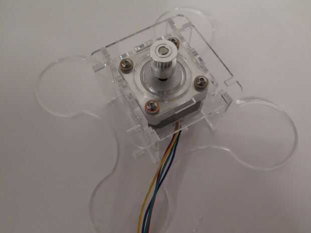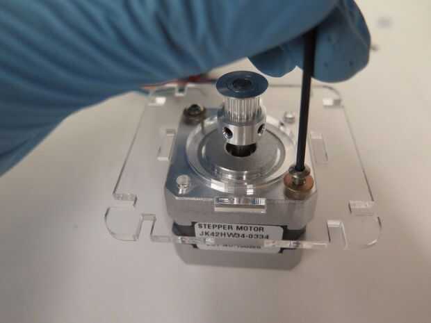 Agregar un equipo a su eje de motor paso a paso y apriete el tornillo de fijación con una llave hexagonal. Luego poner arandelas a los tornillos y fijar el motor paso a paso sobre la placa de la cara. Después se pueden montar las tres placas de retención para el motor, ellos son los que con los agujeros. Añadir el motor de paso a paso que ahora se une a la placa frontal y utilice el cemento acrílico para mantener todo en su lugar.
