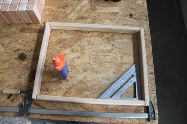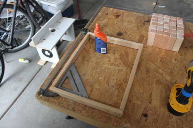 reuní con 8 1 1/4" tornillos para madera y pegamento para mantener Unidas al armazón. Para asegurarse que sea cuadrada puede ayudar a mantener las "tropas" espaciadas uniformemente más adelante.
