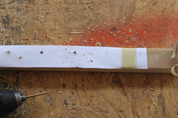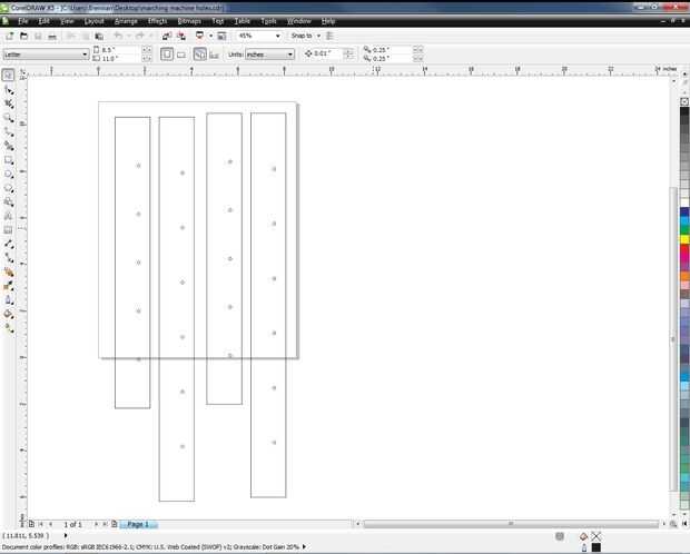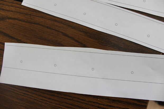 Para los agujeros en el armazón, usé Corel Draw para hacer una plantilla. Lo hice más porque es más fácil que lidiar con las mediciones en una cinta de medición. La plantilla se muestra donde cada agujero debe ser perforado y el espacio es el mismo entre todos los agujeros. Las plantillas eran más grandes que un pedazo de papel, lo recorto y les grabó juntos.