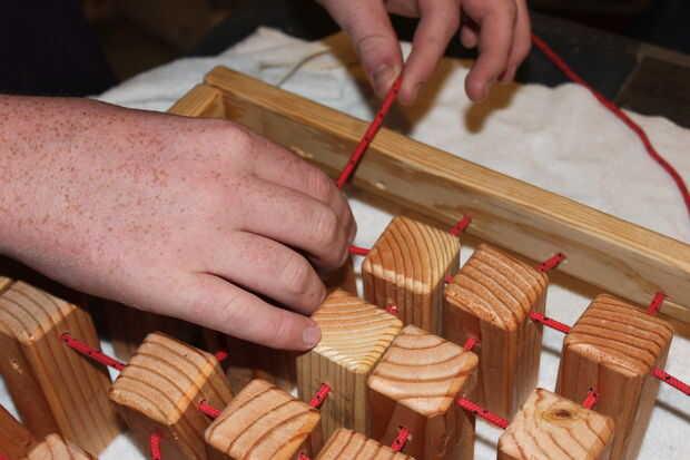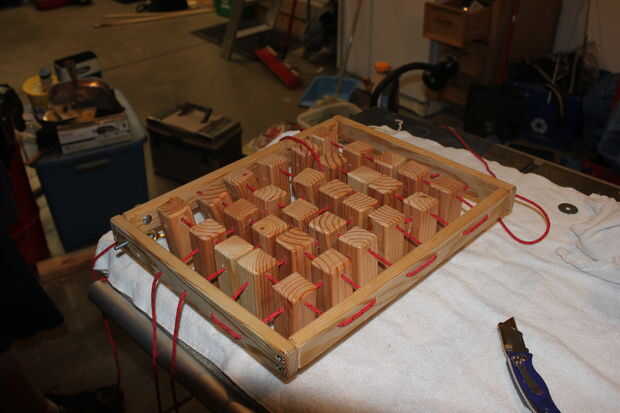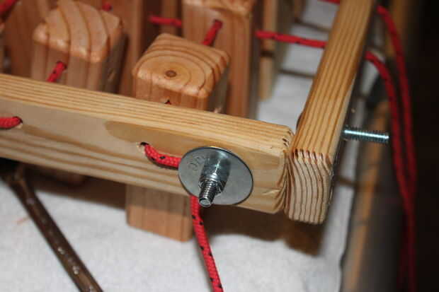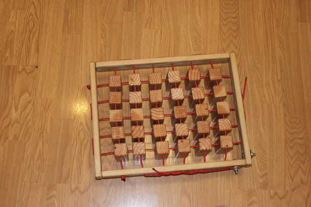 Ejecutar el paracord en un zig-zag a través de todos los agujeros, con un cable separado para cada dirección (uno continuo de la cuerda va hacia arriba y hacia abajo, una izquierda y derecha.) ayuda a tener un juego extra de manos para contener los bloques de les cadena de. Los pernos se utilizan para anclar los extremos sueltos de la paracord, y les permite apretarse para un sonido de música diferente. El paracord extra puede ser tejida en entre los bucles en cada extremo del bastidor para mantenerlo fuera del camino. Una vez que haya terminado, ya está listo para marchar! Divertirse con él!
