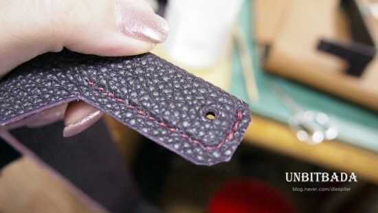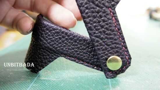1. las piezas laterales del bastidor sólo cosen goma envuelta en el marco de cuero. 2. dejando sólo una parte de los 2 ~ puntada de gap de 3mm, cortar el cuero. 3. perforar agujeros en un punzón de 3mm remaches pueden conectarse dos marcos. 4. la conexión remachada de dos marcos.