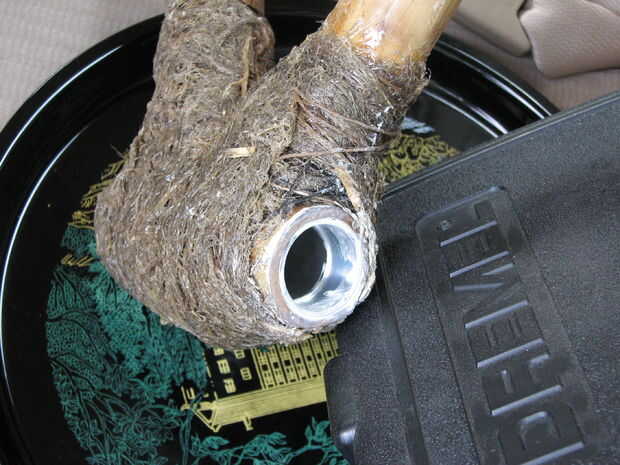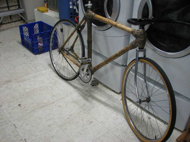 Una vez que haya terminado finalmente con todo el material sucio, corte el tubo a la medida y que Deslice la funda de bambú. Pegar con epoxi. Pegar en la caja del pedalier. No se nada en los hilos de rosca, va a ser un dolor enorme para conseguir la munición real si atornillar para arriba de los hilos. He utilizado el stock de sobra tubo a "cuña" (una cuña muy muy grasa) el tamaño del tubo de asiento abajo asi las tijas de sillín normal cabrían.