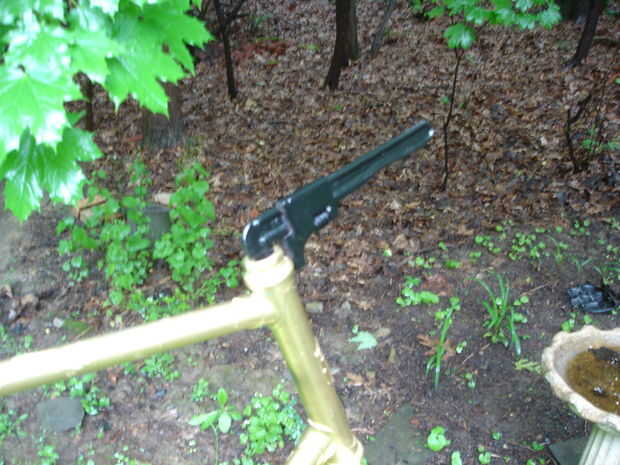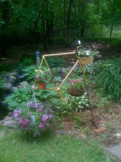 Usé una llave de tubo vieja como titular de una planta conectado a la parte delantera del bastidor y y llave antigua a la tija de sillín.