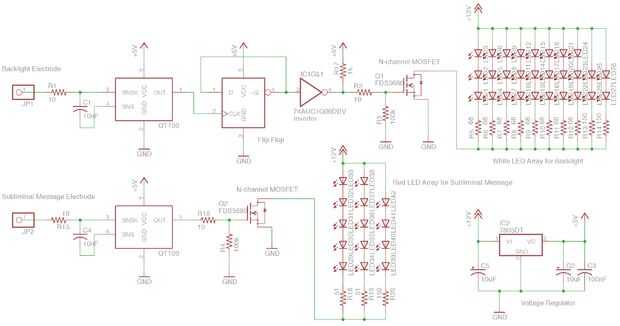 Bien, como sucede a menudo en mi cerebro, complejidad aumentó a una tasa geométrica y surgió este cartel madre de todos los marcos. Está iluminado mediante LEDs blancos ultrabrillantes 28, montados a lo largo de ambos tramos de la estructura. Se activa mediante un sensor táctil capacitiva. Utiliza tecnología de montaje superficial. Y lo mejor de todo, usted puede activar un mensaje subliminal de la película serenidad que * podría * le flipan y vencer a todos en la sala a una pulpa.