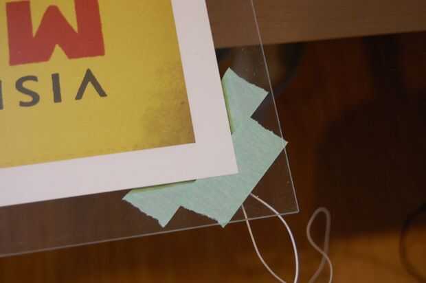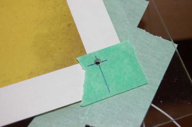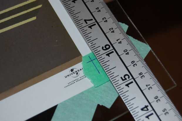 En cada esquina del cartel, palo abajo un cuadrado de cinta adhesiva y dibujar una cruz alrededor de 5mm de cada esquina.