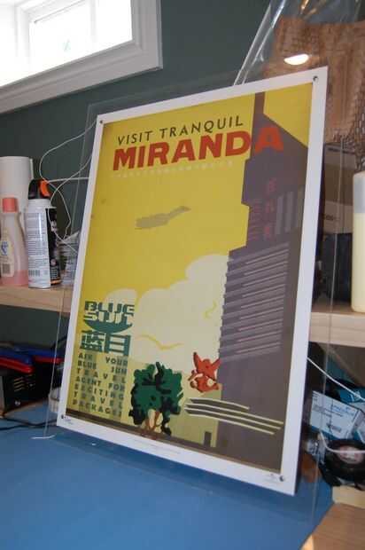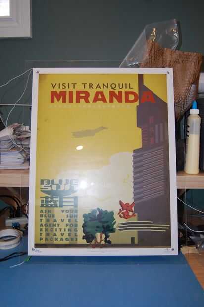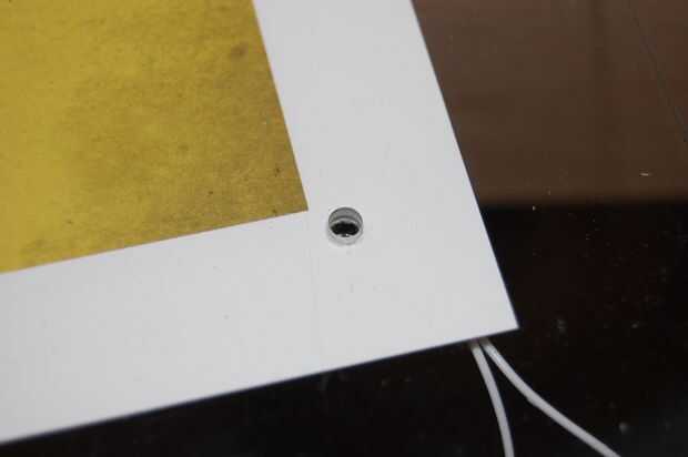 Con todas las capas temporalmente Unidas, ir a tu taladro (o taladro de mano en un apuro) y * cuidadosamente * perfore un agujero en las cuatro esquinas del cartel. El agujero debe pasar por las tres capas de plástico y de frontera del cartel.