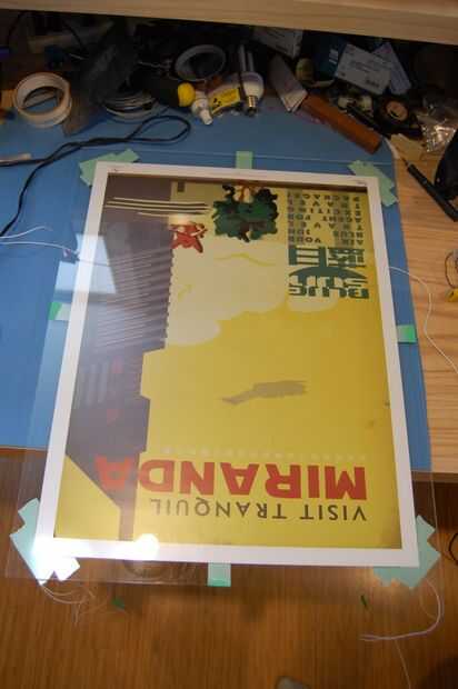 Coloque el cartel boca abajo en la capa superior y alinee para que la misma cantidad de plástico es visible por todos lados. Cinta adhesiva en su lugar con cinta adhesiva. Voltee la pieza superior y ponerlo encima de las capas media e inferior. Tratar de iluminar la capa inferior para ayudar a alinear el cartel. Todas las capas con cinta adhesiva de la cinta.