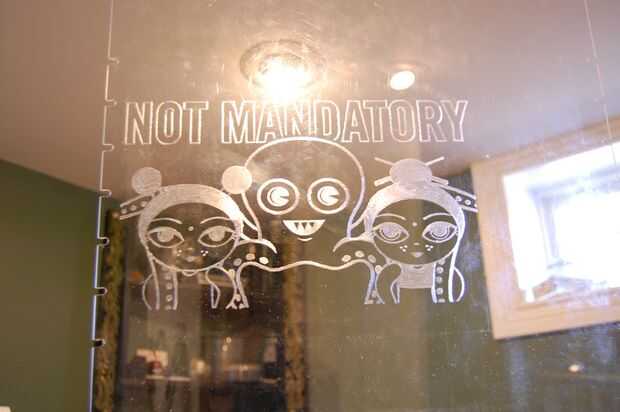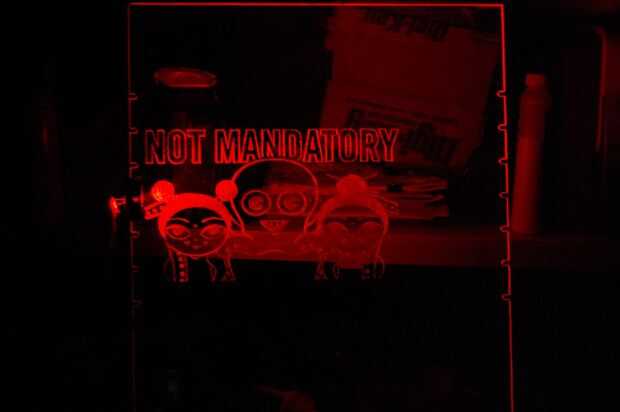 Utilicé el método ahora-ubicuo de la iluminación de borde de una imagen grabada en el plástico, para que la imagen grabada se ilumina pero el resto del plástico sigue siendo oscuro. La imagen brilla a través del cartel cuando se enciende, pero es casi invisible cuando apagado.