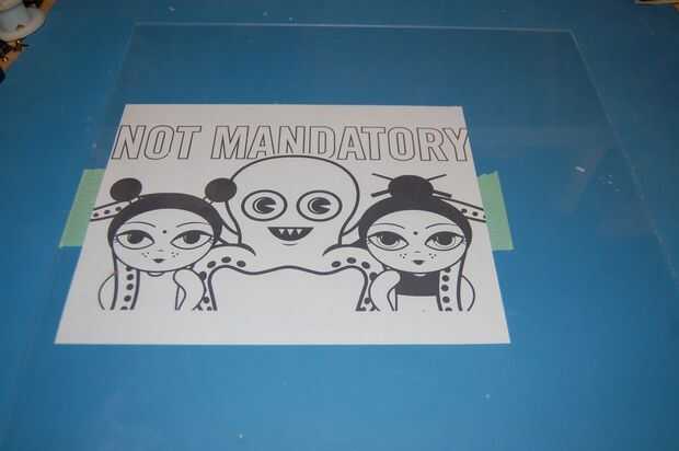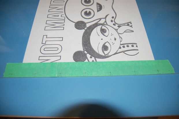 Si hay alguna, retire la película del lado que será grabado. La imagen en un lado del plástico, teniendo cuidado de alinear con el espacio vacío de amarillo en el cartel de la cinta. El lado impreso de la imagen debe estar contra el plástico, por lo que es visible cuando se mira a través de la plástica. La imagen será grabada en la cara que se sentará finalmente directamente contra el cartel, para la resolución más nítida.