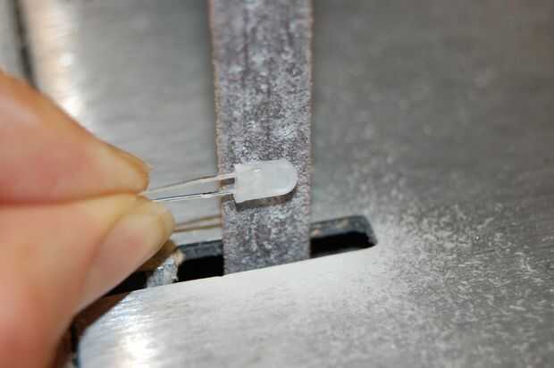 Si usas LEDs de 3mm que no tenga que eliminar cualquier material a todos. Del mismo modo, si usted ha utilizado plástico más grueso entonces tendrás que los LEDs como fina de arena.