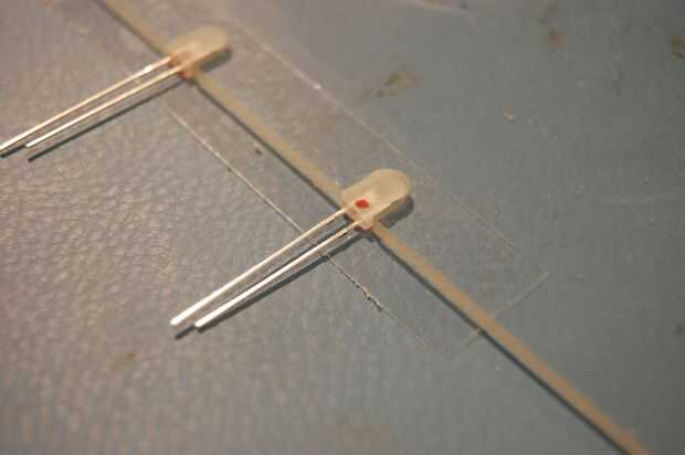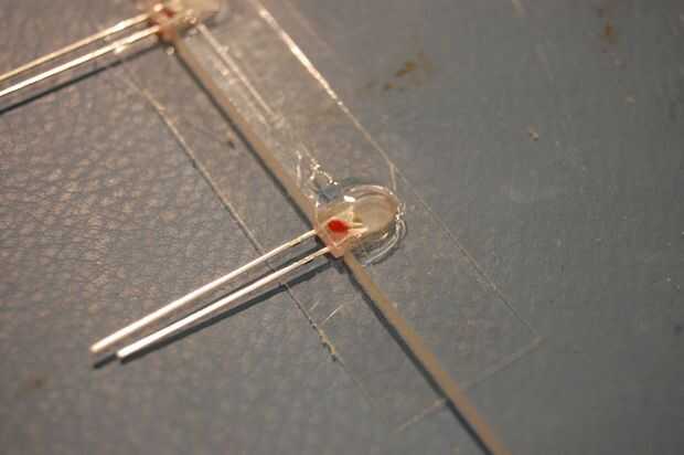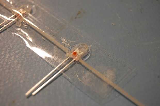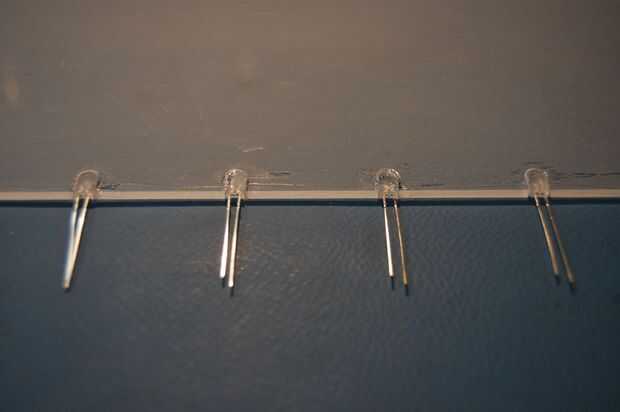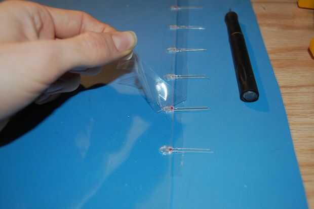 Dentro de cada muesca, meter en un LED por lo que es empujado tan fuertemente en la ranura como sea posible. Su polaridad, cada LED debe ser colocado el mismo. Poner un pegote de pegamento en cada LED y deje que se difunda en los boquetes. Una vez que todos los LEDs se pegan, coloque otro pedazo de cinta de embalaje sobre los LEDs y presione ligeramente sobre cada uno, para que el pegamento se exprime más entre los huecos.